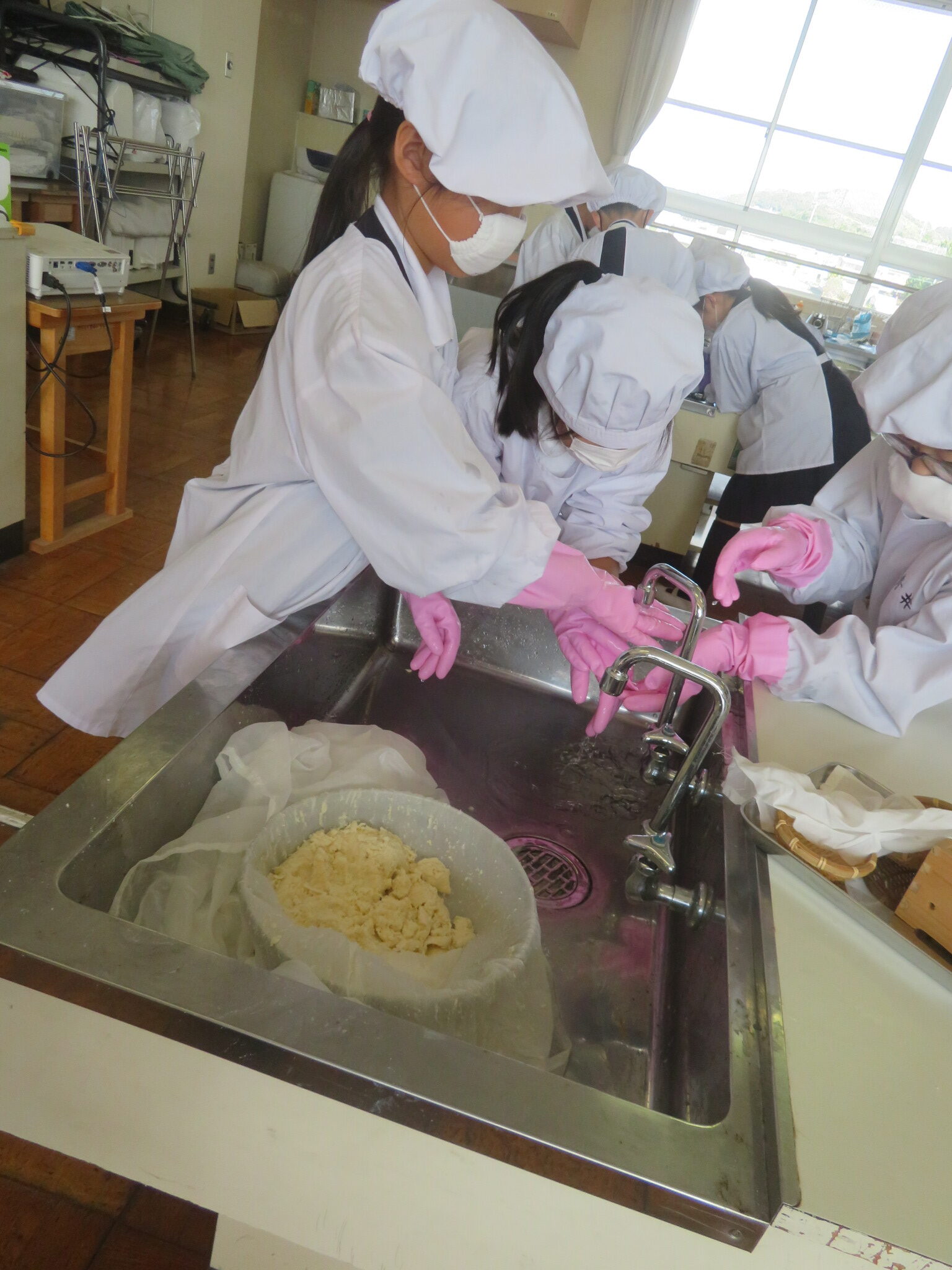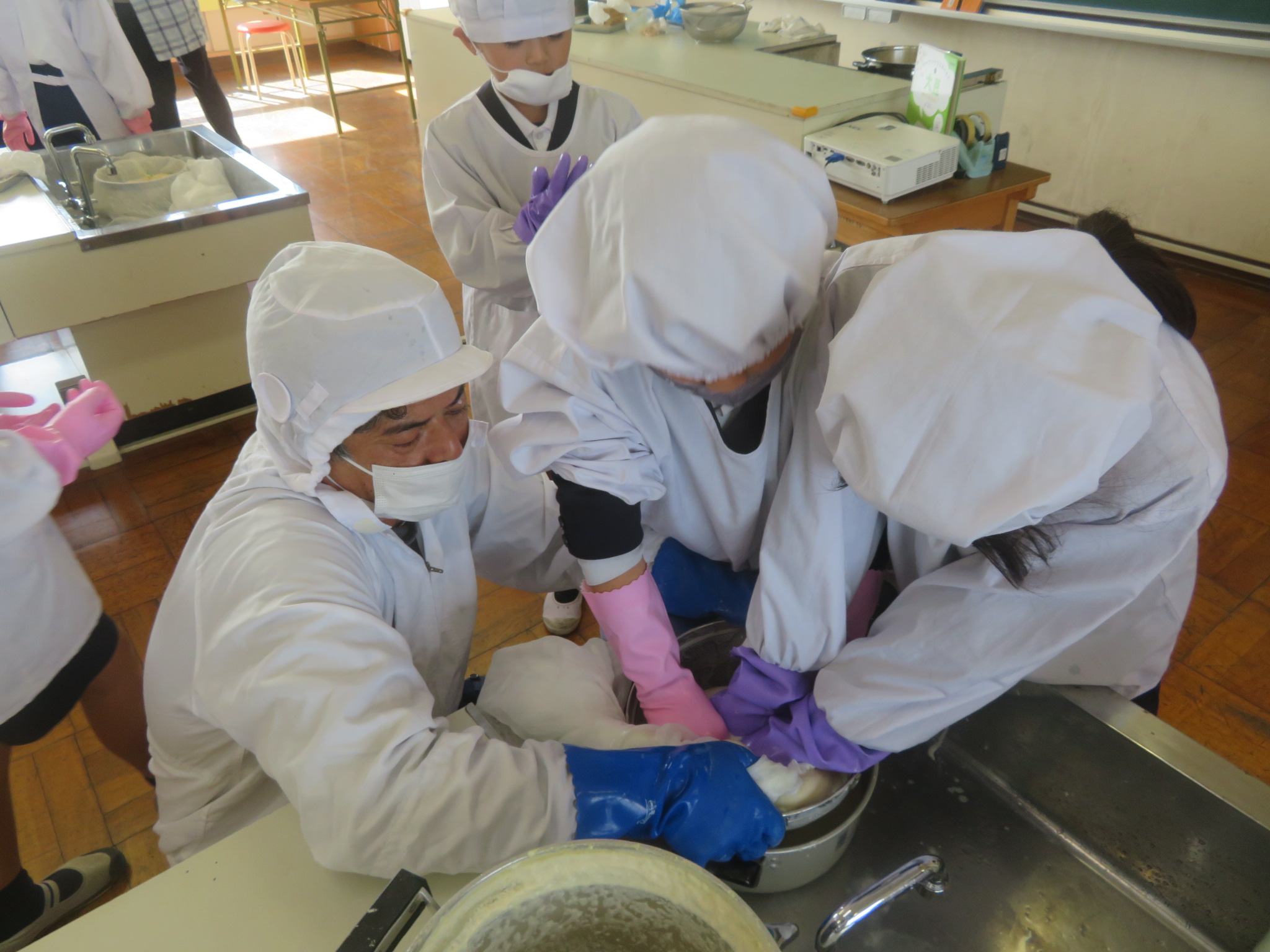 【「豆腐ってすごい!」〜地域の名人から学ぶ、国語と食のつながり〜(3年生)】3年生は、国語科の学習を発展させ、校区にある豆腐店の方を講師にお迎えして本格的な豆腐づくりを体験しました。地元の食文化を学ぶ「食育」としての意味合いも含みます。子どもたちは、まず水につけた大豆をミキサーにかける工程から、興味津々。煮た豆乳の湯気や香りをかいだり、初めて見る「にがり」の役割に目を輝かせていました。特に、ドロドロの液体がにがりによって瞬時に固まっていく様子や、布にこして絞った後、熱々のおからと豆乳ができた時には大きな歓声が上がりました。出来上がったお豆腐は、その後、全員で試食しました。自分で作った豆腐の格別な味に感動した様子でした。今回の学習は、国語の授業で終わるのではなく、地域の専門家から「本物」を学ぶ貴重な体験となりました。ご協力いただいた豆腐店さん本当にありがとうございました。